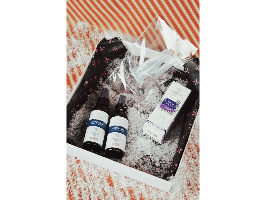 Balíček v dárkovém vánočním balení obsahuje pomůcky k masáži obličeje malou a velkou baňkou.
