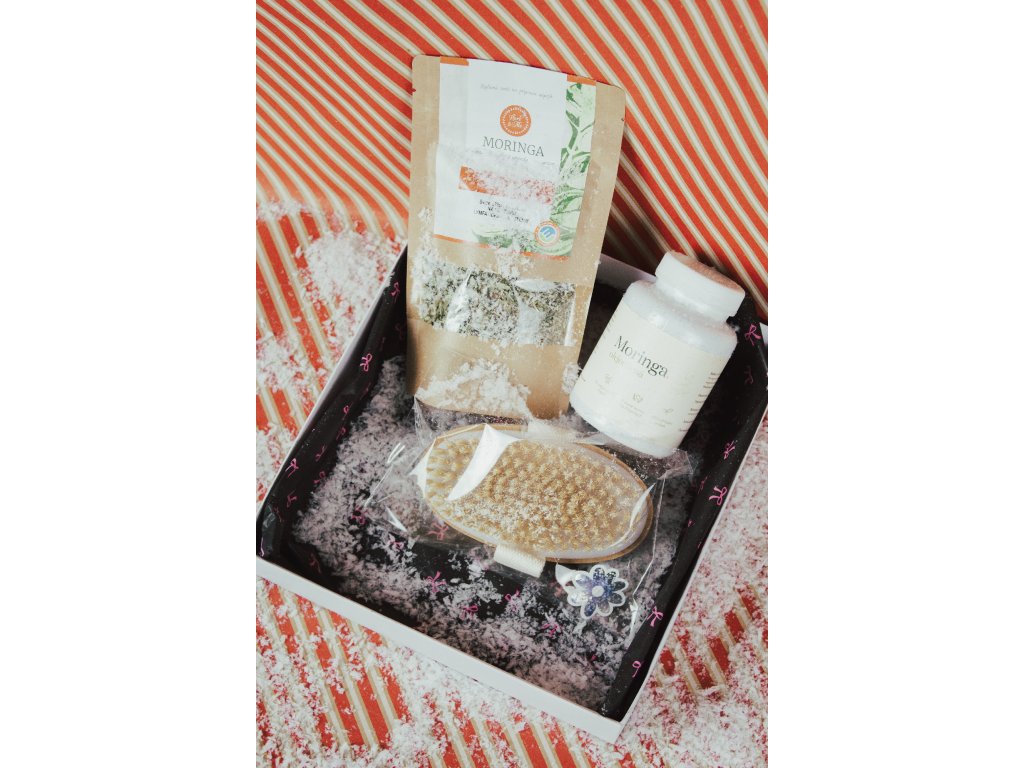 Balíček v dárkovém vánočním balení obsahuje pomůcky k masáži a aktivaci lymfy.