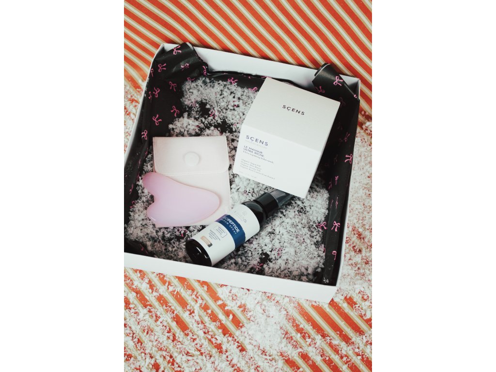 Balíček v dárkovém vánočním balení obsahuje pomůcky k masáži obličeje pomocí kamene gua sha.
